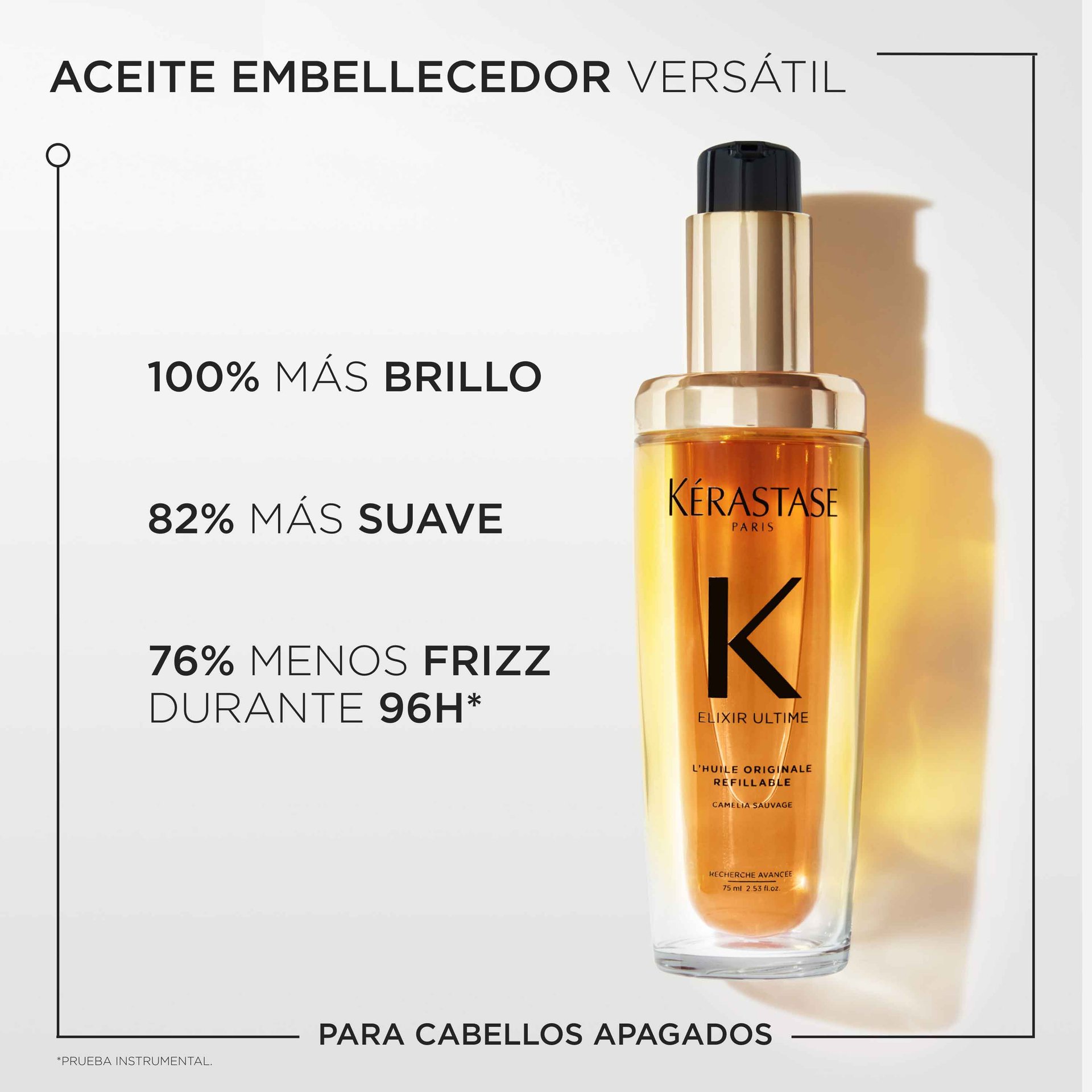 Ultraligero para una absorción más rápida, este elixir exquisito aporta luminosidad y un brillo radiante al cabello opaco, seco o con frizz, y actúa como protector térmico durante el peinado.