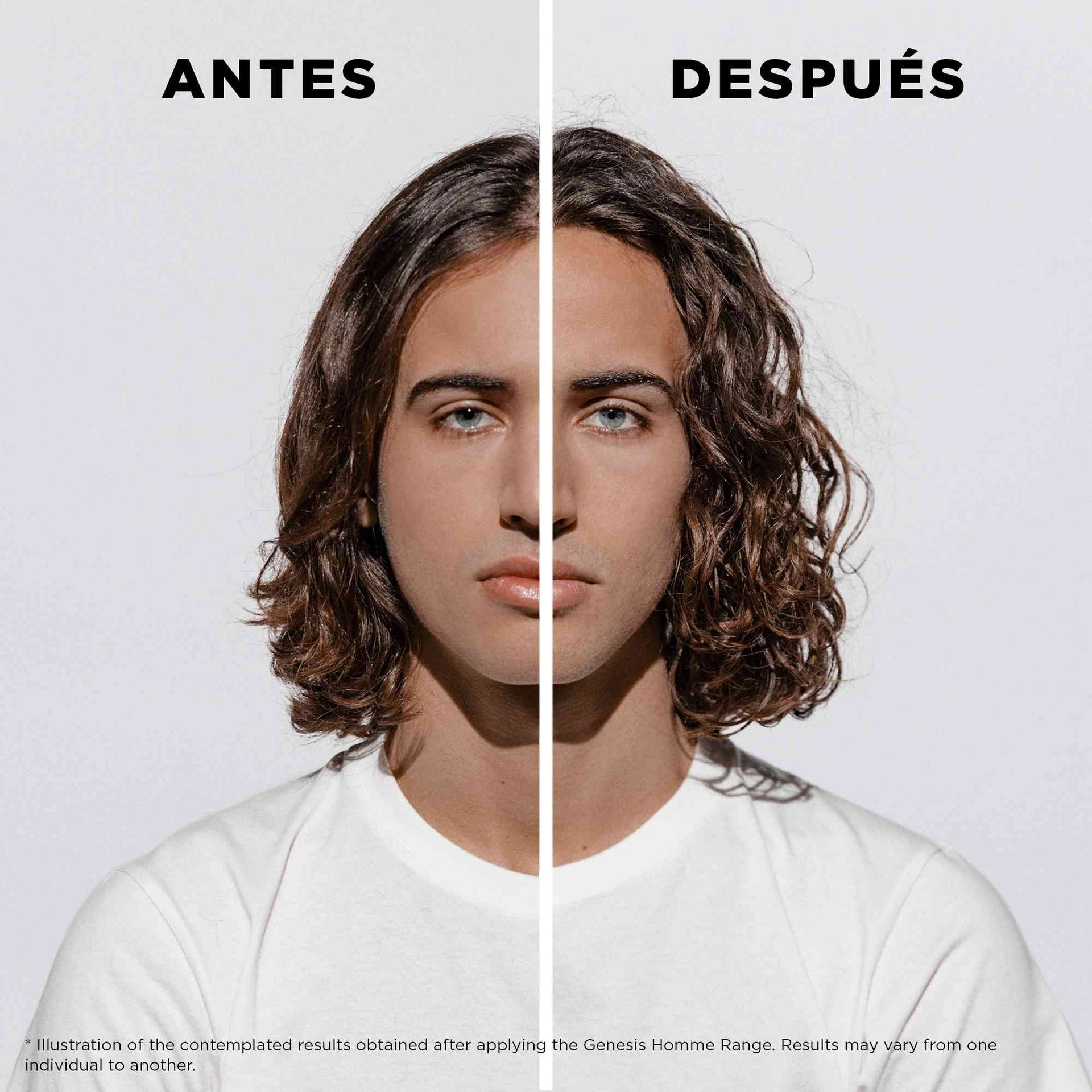 Genesis Homme tiene dos baños. El primero, Bain de masse épaississant, es para la caída del cabello un poco más avanzada y Bain de force quotidien es un Shampoo purificante y fortificante. Una pequeña cantidad es muy útil, confía en mí.